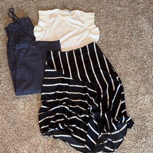 It's a clothing bundle that includes an asymmetrical black and white striped skirt, a white ruffled top, and a long, sleeveless navy and white striped dress, all size L. I'm selling all 3 pieces for one price.