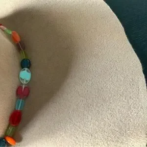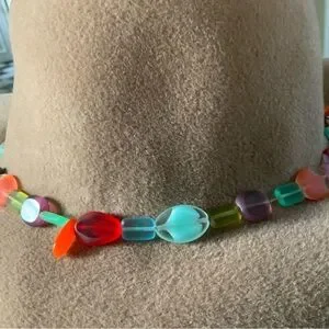 Stylish tan hat with a vibrant beaded band. Perfect for any occasion.