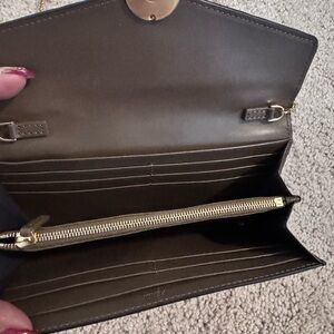 Stylish Fendi clutch with iconic logo pattern. Features a sleek design and gold chain strap. Perfect for any occasion.