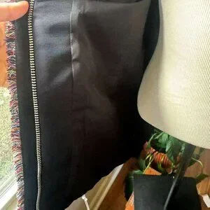 Textured w/ fringe yarn eyelash trim. Hidden zip placket. Silvertone front zip hidden under sateen twill tape trim