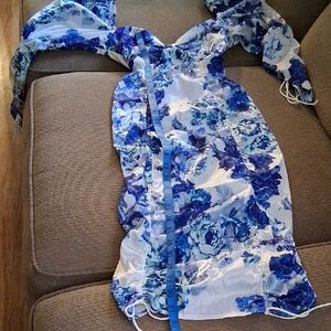 Chic dress with vibrant blue floral design on white. Ideal for stylish outings.