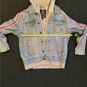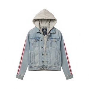 Stylish jean jacket with hood. Features red and white striped sleeves. Perfect for casual wear. Smoke free and pet free home! Send me an offer! Or bundle with other items to save on shipping! 😃👍 Contact me with any questions! 🥰