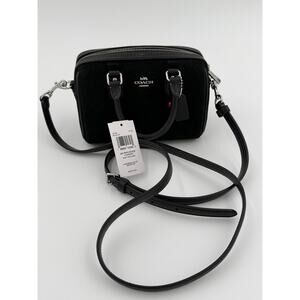 Coach Mini Rowan Crossbody Bag with Cherry Charm, specifically the style number CDC93. This bag is crafted from black suede and smooth leather with silver-tone hardware and includes both top handles and a detachable strap for shoulder or crossbody wear.