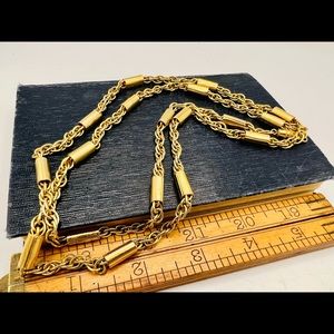 Beautiful vintage gold tone unique chain necklace with metal tube/wrapped segments, in great condition! Appx 36” long.