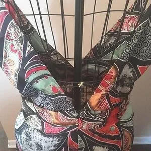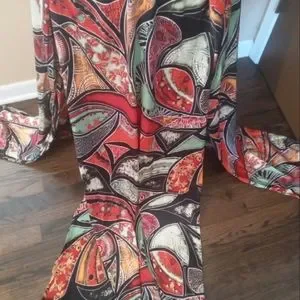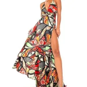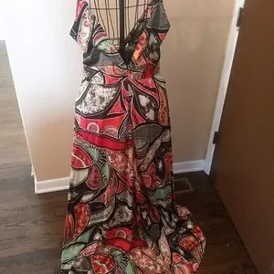 Akira tropical/floral print maxidress. Exotic black/red/green/orange/dark yellow/gray/cream colors. Front and back v-neckline with adjustable spaghetti straps. Thigh-high double front splits. Back zipper closure.