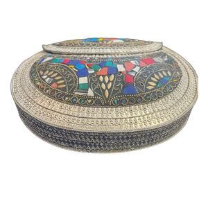 A beautiful gift of unique metal clutch purse from the Indian craftsmen. The clutch is hand inlaid with mosaic. Such metal clutch bags is a very old art yet they have been recently introduced as a fashion statement.