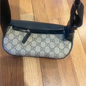 Elegant Gucci belt bag with signature pattern. Features black accents and secure zip closure. Mint Condition. Do not have proof of authenticity as I got it as a gift and price reflects that.