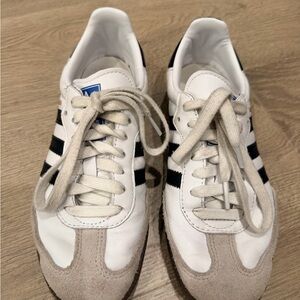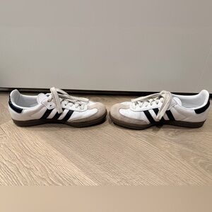 Step up your style with the classic Adidas Samba shoes. Featuring a sleek white and black design, these shoes offer both comfort and timeless appeal. Perfect for any casual occasion.