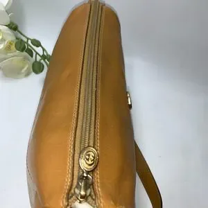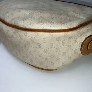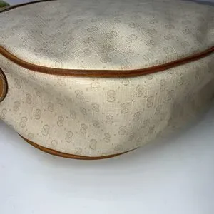 Elegant Gucci crossbody bag. Features tan leather accents. Cream canvas with subtle logo pattern. Perfect for everyday use.