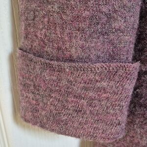 Chic lavender cardigan with elegant floral accents. Perfect for layering.