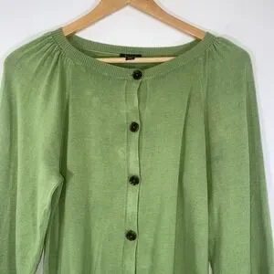 Women's Ann Taylor Factory green cardigan sweater featuring a classic button-front design with long sleeves and ribbed trim. Soft, lightweight knit that layers easily for work or casual wear.