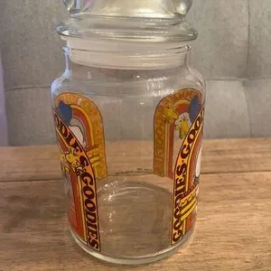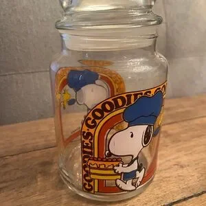 Vintage Snoopy Glass Cookie Jar with Blue and Orange Design