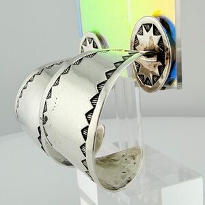 These impressive, heavy-gauge sterling silver earrings feature a bold, tapered cuff-hoop design. Hand-stamped with a precise sawtooth border and accented by sunburst-stamped oval tops, these earrings bridge the gap between traditional Southwestern craftsmanship and modern statement jewelry.