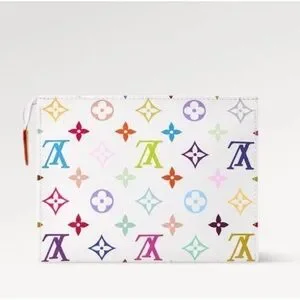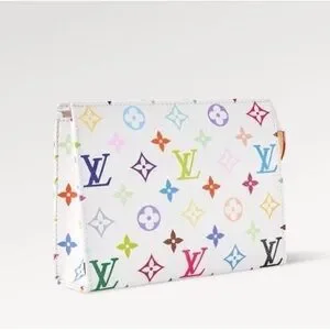 The Louis Vuitton Murakami Toiletry Pouch 19 in White with Multicolor Monogram is a stylish and limited-edition cosmetic bag. Featuring a rectangular shape with a zip closure, this clutch is both practical and fashionable. The exterior is made from Monogram coated canvas with multicolor accents, while the gold hardware adds a touch of luxury. This exclusive item comes in its original box and dust bag, making it a perfect accessory for various occasions from casual to formal. Ideal for travel, weddings, parties, and everyday use, this LV x TM Toiletry Pouch 19 is a must-have for women who appreciate high-end fashion.