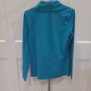 Teal pullover with half-zip. Features front pockets. Comfortable and stylish.