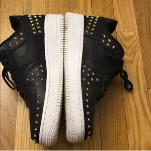 Stylish black sneakers with gold star accents. Comfortable and trendy design. Perfect for casual wear.