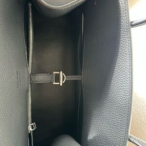 Structured shoulder bag in matte grained calfskin leather with elongated tubular handles, signature adjustable buckles, and narrowed gusseted side panels.