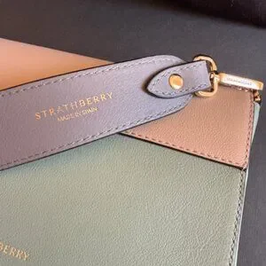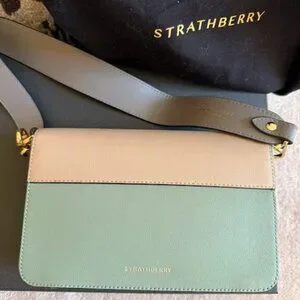 I am reluctantly parting with this gorgeous green and beige and gray Strathberry Melville. The bag is green and beige and the shoulder strap is gray. This bag is truly beautiful but too small for my needs so I never carry it. 100% calf leather, gold colored hardware. Used maybe twice.also comes with original box and dustbag.