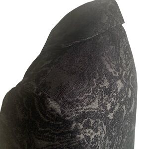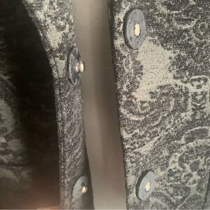 Liz Claiborne Jacket from the Classics collection. Textured Brocade Blazer in a Paisley print. Hidden snap front closures. Two pockets. No vent. Brocade, 80’s inspired, Baroque, Vintage, Retro, Victorian, Event Jacket. Black on Black. Size Small. Great/excellent Used Condition GUC.