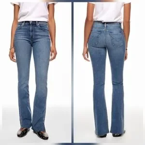 The Hudson Barbara High-Rise Bootcut Jeans feature a sleek silhouette with a modern bootcut fit and high-rise waist. Pair them with a fitted turtleneck and block heels for a flattering, leg-lengthening look.