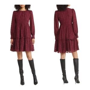Eliza J Dress floral long sleeve tiered dark red size 6 E1451 E2081