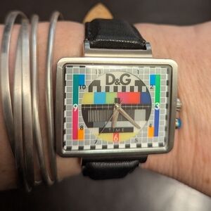 Watch by Dolce & Cabbana with a static TV screen face. Runs beautifully on a fresh battery and the dial lights up slightly when the blue button is pushed.