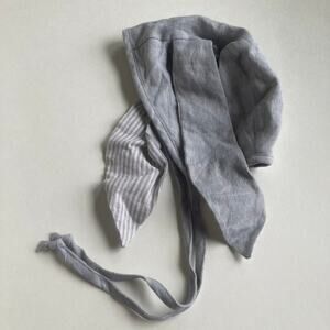 Pale gray baby bonnet with bunny ears. Rabbit ears have tan and white stripes. Chin straps for a snug fit.