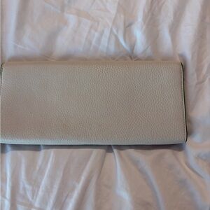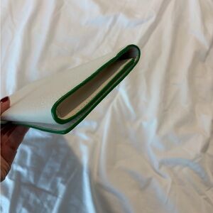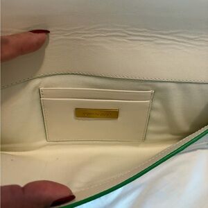 This stylish off white clutch with green accents is perfect for any occasion. Its elegant design adds a touch of sophistication to your outfit. In very good condition.