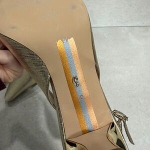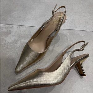 Chic gold slingback heels. Perfect for elegant outings. Comfortable and stylish.