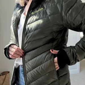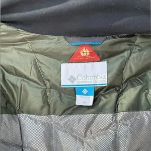 Olive puffer jacket by Columbia. Omni heat interior with thumb holes at the sleeves. Perfect for outdoor activities.
