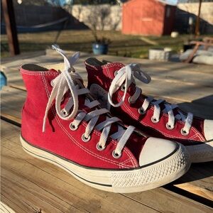 Stylish red Chuck Taylor high-top Converse sneakers with white laces and soles. Worn well but cleaned up nice with plenty of life left. These don’t fit me anymore.