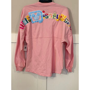 This is a new, pink long-sleeve Disney Spirit Jersey in size XS, as indicated by the attached tag. The front features a glittery pink "D" with a Mickey Mouse head silhouette and "EST. 1971" below it. The back displays "Disney World" in large, colorful, embroidered letters with various Disney-themed icons, including a Cinderella's slipper, an apple, and a Mickey Mouse head with Spaceship Earth. The shirt has a relaxed fit with dropped shoulders and a horizontal seam across the chest and back. A small blue Disney tag is sewn near the bottom hem on the front. Brand new, from Disney Parks, authentic