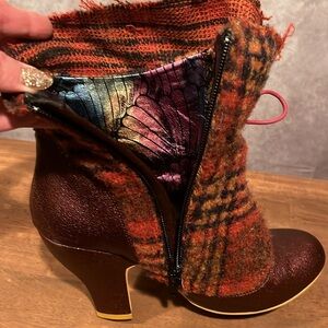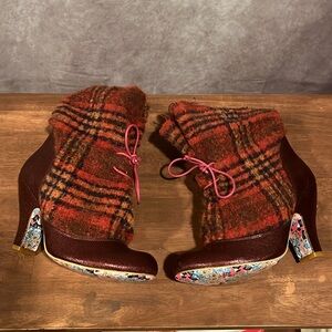 New pair of Vibrant multicolor shoes by Irregular Choice. Unique and stylish design. Ankle boots with metallic deep ruby red toe and heel paired with a fuzzy tartan laid with raw hem upper. Drawstring laces to gather material at the ankle. New and unworn, no box. These are a tad bit small for an 8 and probably fits a 7.5 or a snug 8.