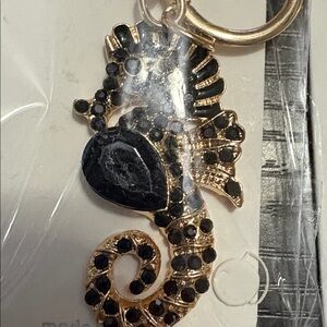 Colorful seahorse keychains by Mint. Includes shades of pink, red, blue, and black with gold details.