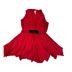 Commanding attention, this vibrant red blouse is a statement piece crafted to empower your presence. A dramatic collar plunges into a flattering V-neckline, creating an alluring silhouette that's both sophisticated and daring. A wide, high-shine black belt cinches the waist, accentuating your curves and adding a touch of edgy glamour to the flowing shape. in an asymmetrical cascade, offering delightful movement and visual intrigue. Envision yourself captivating at a cocktail party, commanding attention at a networking event, or making a grand entrance at a special occasion.