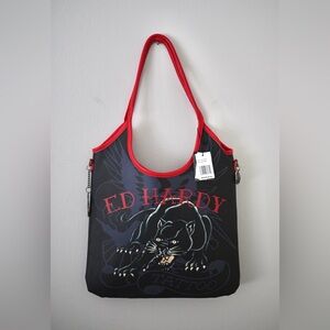 Keywords: Ed Hardy tote bag, Ed Hardy purse, Y2K tote bag, Y2K purse, panther tote, black panther bag, vegan leather tote, rock and roll bag, tattoo style purse, early 2000s fashion, rare Ed Hardy bag, NWT Ed Hardy tote, graphic tote bag, statement purse, skull charm bag, designer Y2K handbag, alternative fashion bag, edgy streetwear tote, collectible Ed Hardy, oversized tote bag