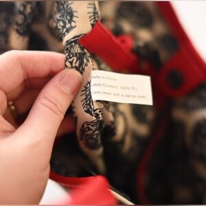 Made from smooth, sturdy, lightweight vegan leather with a cotton lining featuring a panther pattern and stunning bright red trim. The interior is spacious and deep, with a center zip compartment, an additional zip pocket, and two open slip pockets for organization.