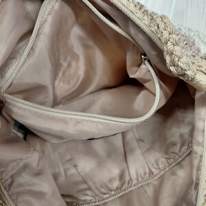 USED IN EXCELLENTCONDITION. Sak Brown Tan Beige Stripe Crochet Shoulder Bag Purse is a stylish and boho chic accessory for women. Made from durable nylon exterior material, this shoulder bag features a unique striped pattern and accentuated with intricate crochet details. The neutral tan color adds a versatile touch to any outfit, making it a fashionable and practical choice for everyday use.