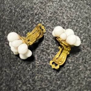 These are vintage Pico brand daisy flower earrings, crafted from white milk glass beads and made in Western Germany.
