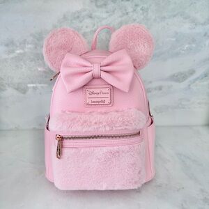 Charming Loungefly backpack with fluffy ears and bow. Soft pink design.