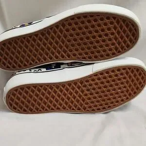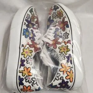 Step out in style with these Vans women's sneakers featuring a vibrant floral design. The white canvas is adorned with colorful orange and purple flowers, perfect for adding a pop of color to any outfit. Comfortable and trendy, these shoes are a must-have for your casual wardrobe. please see all pictures