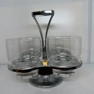 Add a touch of Mid-Century Modern elegance to your bar or kitchen with this 1960s vintage barware set! Featuring a chrome rotating base (Lazy Susan style), this stylish caddy is perfect for serving cocktails or condiments. The set includes four intact glasses that sit securely in the holder, making it both functional and decorative. A must-have for vintage
