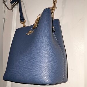 Coach Mini Town Bucket Bag in the highly sought-after "Denim" blue. This bag is in perfect, unused condition. While the original store tags are no longer attached, the leather is stiff, the hardware is mirror-bright, and the interior is spotless.