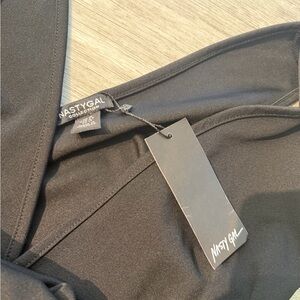 Chic black midi dress with a deep V-neck. Features a stylish side slit. Perfect for evening wear.