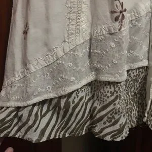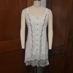 Elegant off white dress featuring intricate brown and off white embroidery details with buttons. This could also be worn as a tunic.