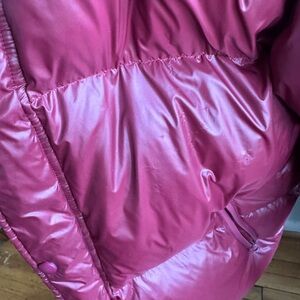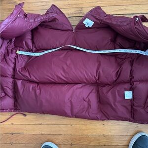 Stylish burgundy cropped puffer jacket with duck down filling. Perfect for super cold weather. Slightly used, some minor scratches shown in photos 7 and 8. Says small but I am medium/large and it fits me. Meant to be oversized