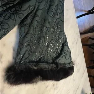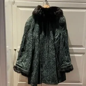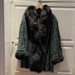 Stay warm and stylish with this elegant green jacket featuring a luxurious faux fur trim. Perfect for adding a touch of sophistication to any outfit.