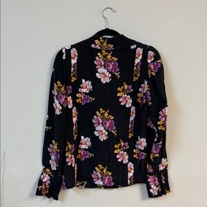 - Tessa Small Peonies Tunic in black with notched lapel, self-tie at neck, pintuck design, and split poet cuff