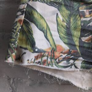 Distressed Denim Grunge Shorts High Rise Tropical Jungle Print Raw Hem Cut Offs