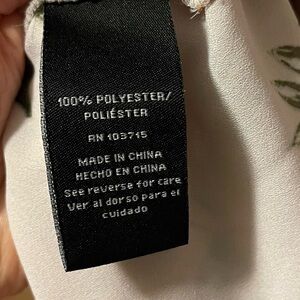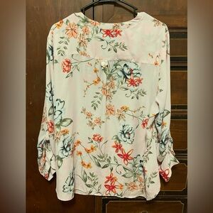Chic floral blouse with a cream base. Features vibrant red and green floral patterns. Perfect for casual or dressy occasions.